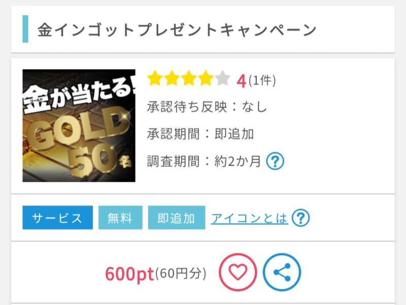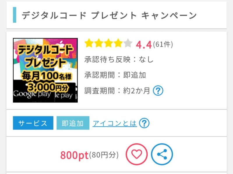 そのときにもよりますが”ポイント即追加案件”は50種類以上あるので、「案件が無くてポイントが貯められない」ということはありません。