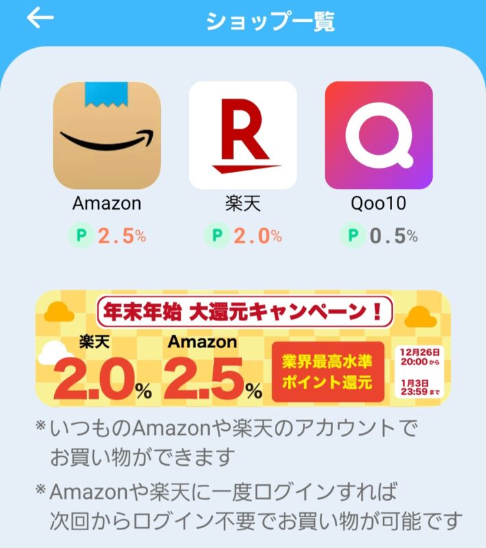 Amazon以外にも「楽天市場」や「Qoo10」の買い物でもポイントを獲得できます。今後、ショップの取り扱い数がさらに増えることに期待しましょう。