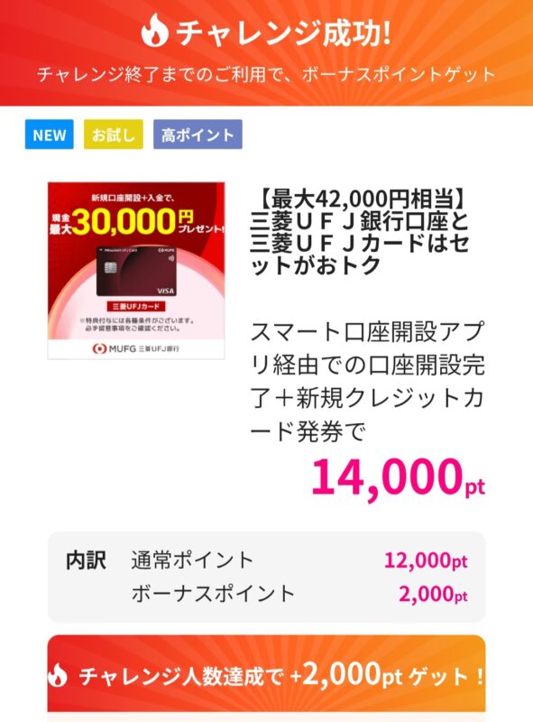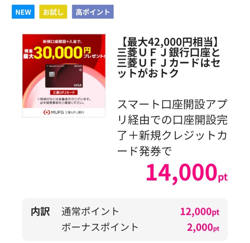 たとえば、ポイントサイト経由で「三菱UFJ銀行」の口座開設をおこなうと、公式キャンペーンで最大で30,000円分の特典をもらえるうえに、ポイントサイト上でも漏れなく14,000円分のポイントをGETできます。