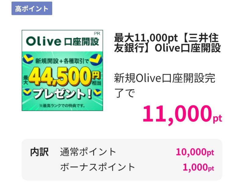 口座開設+特定の条件を伴う案件の場合は大量ポイントを獲得できます。たとえば「三菱UFJ銀行」や「Olive」は、口座開設時にクレジットカードの発行を行うことで10,000ポイント以上も獲得できますよ。