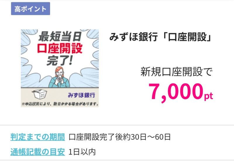 ポイントサイトには、口座開設のみでポイントを獲得てぎる案件がたくさんあります。銀行口座の開設で獲得できるポイントは一般的に1,000〜2,000ポイント程度ですが、高還元の案件なら5,000ポイント以上獲得することも十分狙えます。