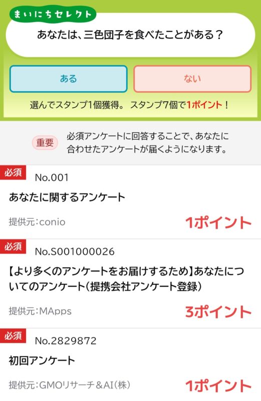アンケートは数も単価も少ないため、あまり期待はできませんが「あとちょっとだけポイントが貯まればポイント交換できる」というときには活用できるかもしれません。