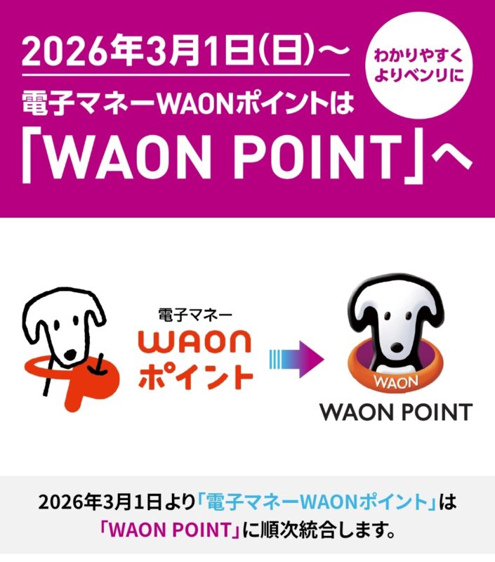2026年3月から「WAON POINT」に統合されましたが、2026年2月時点で所有していた「旧WAONポイント」はそのままで「WAON POINT」にはならないので注意してください。